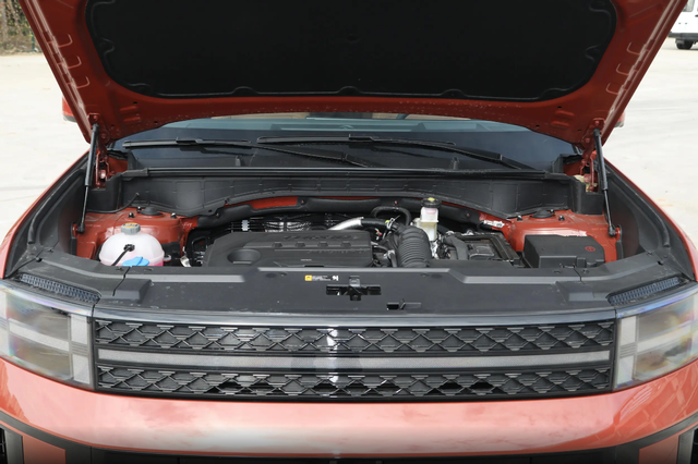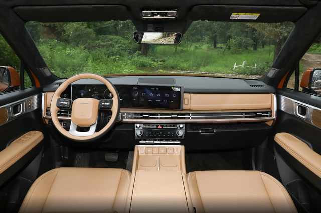 与外观的硬朗气质不同,现代胜达的车内则迎合了目前主流的智能化设计,中控台与扶手箱的组合为较为厚重的T型轮廓,台面加入了贯穿式的出风口结构,内部的镀铬饰条同样构建出“H”型的轮廓,仪表和中控区域采用了双联屏显示,下方则保留了较多的实体按键和旋钮,同时配有手机无线充电板。